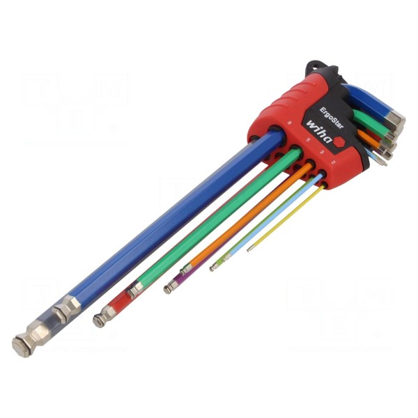 Zestaw zawiera dziewięć kluczy imbusowych o przekroju sześciokątnym w rozmiarach: 1,5mm, 2mm, 2,5mm, 3mm, 4mm, 5mm, 6mm, 8mm oraz 10mm. Narzędzia wyposażono w końcówkę kulistą, która umożliwia pracę pod kątem względem osi wkrętu, ułatwiając dostęp w miejscach o ograniczonej przestrzeni.