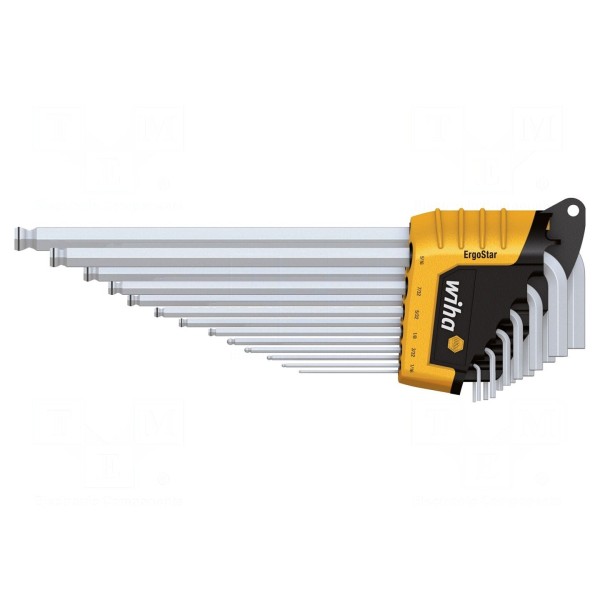 W skład zestawu wchodzą klucze w następujących rozmiarach calowych: HEX 0,05", HEX 1/16", HEX 5/64", HEX 3/32", HEX 7/64", HEX 1/8", HEX 9/64", HEX 5/32", HEX 3/16", HEX 7/32", HEX 1/4", HEX 5/16" oraz HEX 3/8".