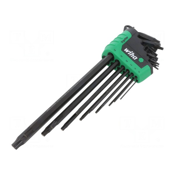 Zestaw kluczy Torx 13 sztuk, stal chromowo-wanadowaZestaw kluczy typu Torx obejmuje trzynaście elementów o rozmiarach TX5, TX6, TX7, TX8, TX9, TX10, TX15, TX20, TX25, TX27, TX30, TX40 oraz TX45. Narzędzia wykonano ze stali chromowo-wanadowej, która została poddana hartowaniu w celu zwiększenia wytrzymałości materiału. Klucze w wersji MagicSpring posiadają powierzchnię czernioną. Zestaw jest dostarczany w opakowaniu typu blister.