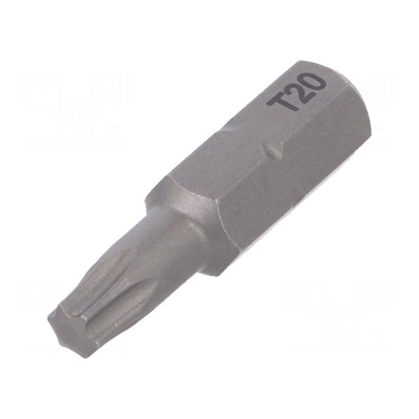 Końcówka wkrętakowa typu Torx o rozmiarze TX20 przeznaczona jest do współpracy z narzędziami wyposażonymi w uchwyt o rozmiarze 1/4" oraz standardzie C6,3mm. Całkowita długość elementu wynosi 25mm.