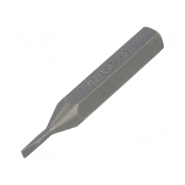 Końcówka wkrętakowa o profilu płaskim przeznaczona jest do współpracy z uchwytami o gnieździe sześciokątnym 4mm. Rozmiar grota wynosi 1,2x0,25mm, co pozwala na precyzyjne prace montażowe.