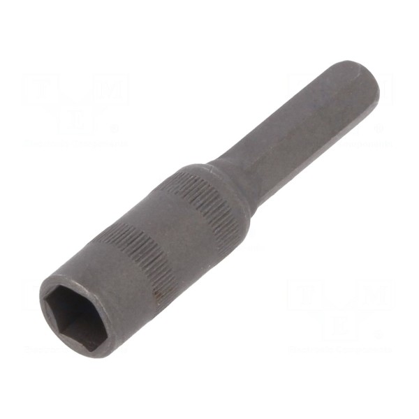 Końcówka wkrętakowa typu nasadka 6-kątna została wykonana ze stali chromowo-wanadowej. Element posiada hartowaną strukturę, co zapewnia trwałość podczas prac montażowych. Konstrukcja końcówki jest przystosowana do pracy z uchwytem o profilu sześciokątnym o rozmiarze 4mm.