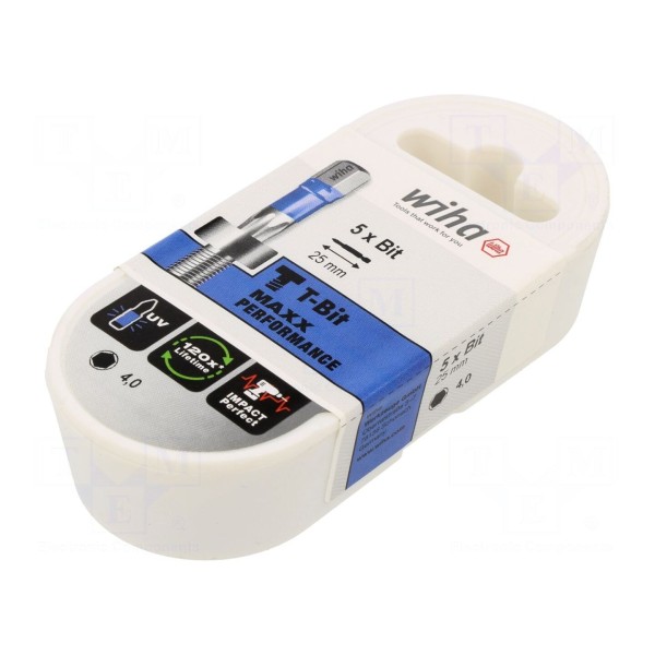 Zestaw zawiera pięć sztuk końcówek zapakowanych w kasetę z tworzywa sztucznego, która pozwala na przechowywanie elementów w uporządkowany sposób. Parametry konstrukcyjne akcesorium są zgodne z wymiarami mocowania C6,3mm.