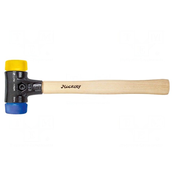 Młotek WIHA 26654 wyposażony jest w okrągły obuch o rozmiarze 40 mm i masie 620 g. Narzędzie posiada dwie wymienne końcówki o różnej twardości: niebieską wykonaną z miękkiego elastomeru oraz żółtą o średniej twardości.