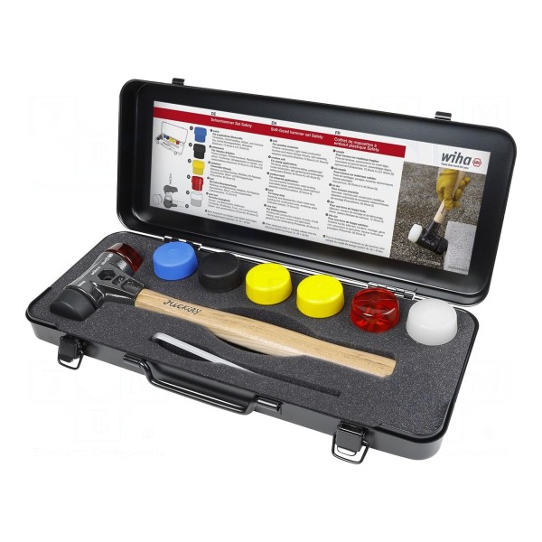 Właściwości narzędzia obejmują zróżnicowane twardości końcówek: biała jest bardzo twarda, pomarańczowa twarda, żółta średnio twarda, czarna średnio miękka, a niebieska wykonana z elastomeru charakteryzuje się miękkością. Całkowita długość młotka wynosi 280mm.