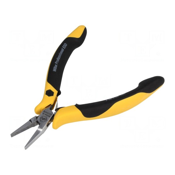 Szczypce płaskie ESD o długości 120 mm wykonane ze stali. Narzędzie zostało zaprojektowane w wersji ESD, co pozwala na bezpieczną pracę w strefach chronionych przed wyładowaniami elektrostatycznymi zgodnie z normą IEC 61340-5-1.