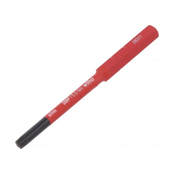 Trzon wymienny ElectricVario to izolowane narzędzie typu Torx® PLUS w rozmiarze 20IP, przeznaczone do pracy pod napięciem do 1kV AC. Element posiada sześciokątny uchwyt o średnicy 6mm, zapewniający stabilne mocowanie w systemach typu slim vario oraz slim Torque VDE marki Wiha. Całkowita długość trzonu wynosi 75mm.