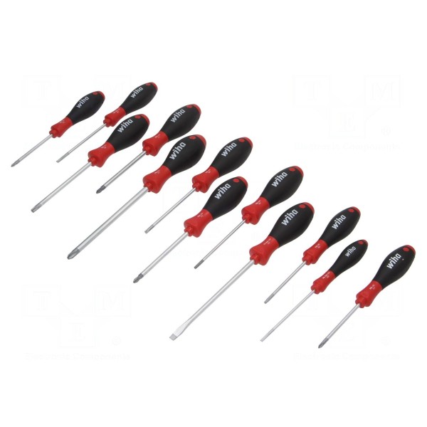 W skład kompletu wchodzą narzędzia o następujących parametrach: płaskie 0,6x3,5 mm (ostrze 100 mm, dł. całk. 204 mm) oraz 0,8x4 mm (ostrze 100 mm, dł. całk. 211 mm), 1,2x6,5 mm (ostrze 150 mm, dł. całk. 268 mm). Zestaw uzupełniają wkrętaki krzyżakowe PH1 (80 mm/191 mm), PH2 (100 mm/218 mm), PH3 (150 mm/274 mm), a także typu Pozidriv PZ1 (80 mm/191 mm) oraz PZ2 (100 mm/218 mm).