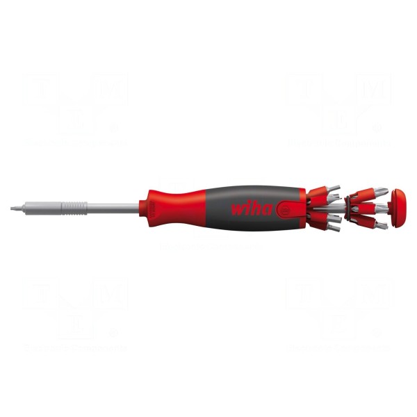 Narzędzie zostało zaprojektowane do współpracy wyłącznie z dedykowanymi bitami podwójnymi marki Wiha. W zestawie znajduje się uchwyt wkrętakowy oraz komplet końcówek wkrętakowych. Dzięki przechowywaniu bitów bezpośrednio w rękojeści, użytkownik ma zapewniony szybki dostęp do potrzebnego osprzętu w trakcie pracy.