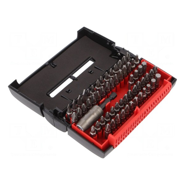 Kompletny zestaw końcówek wkrętakowych obejmuje szeroki zakres profili roboczych, w tym typy imbus, Phillips, płaski, Pozidriv oraz Torx. Każda końcówka charakteryzuje się długością całkowitą wynoszącą 25 mm oraz uchwytem typu C6,3 mm. Dostępne rozmiary obejmują warianty HEX (3, 4, 5, 6 mm), PH (1, 2, 3), PZ (1, 2, 3), płaskie SL (4,5; 5,5; 6,5; 8 mm) oraz TX (10, 15, 20, 25, 30, 40).