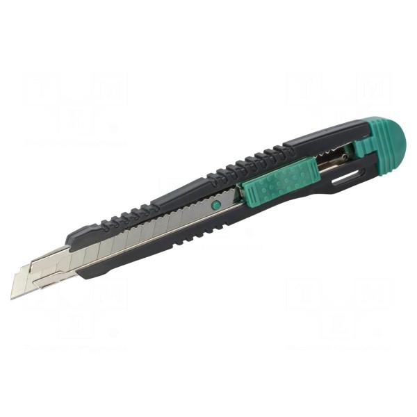 Uniwersalny nóż o szerokości ostrza 9 mm wyposażony jest w mechanizm wysuwanego ostrza łamanego. Konstrukcja posiada zintegrowaną blokadę, która zabezpiecza ostrze w wybranej pozycji podczas użytkowania.