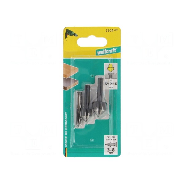 Zestaw pogłębiaczy marki Wolfcraft obejmuje trzy elementy o średnicach 6mm, 12mm oraz 16mm. Narzędzia zostały wykonane ze stali narzędziowej, co pozwala na ich wykorzystanie do obróbki materiałów takich jak drewno, metal oraz plastik.