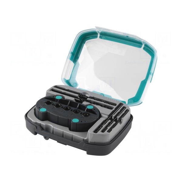 Konstrukcja narzędzia umożliwia wiercenie w przedmiotach o okrągłym przekroju. Stabilność podczas pracy zapewniają antypoślizgowe podkładki umieszczone w podstawie prowadnicy. W zestawie znajdują się wiertła.