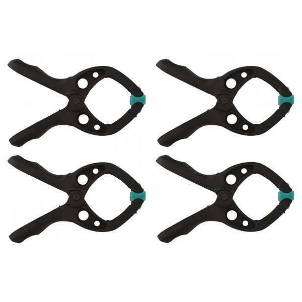 W zestawie znajdują się 4 sztuki ścisków. Produkt przeznaczony do zastosowań wymagających precyzyjnego unieruchomienia materiałów.