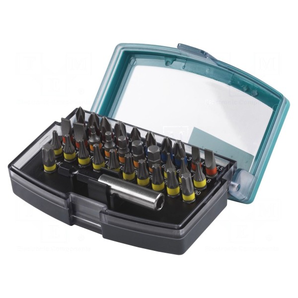Zestaw zawiera 32 sztuki końcówek wkrętakowych o różnych rodzajach grotów, w tym imbus, Phillips, płaski, Pozidriv oraz Torx. Narzędzia przeznaczone są do pracy z uchwytem o rozmiarze 1/4 cala i standardzie mocowania C6,3mm.