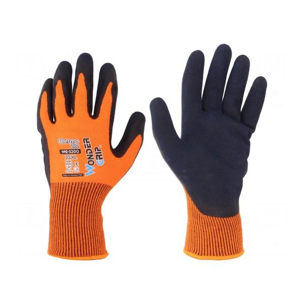 Rękawice ochronne zostały wykonane z połączenia akrylu oraz lateksu, co zapewnia odpowiednią charakterystykę materiałową dla tego typu osłony dłoni. Model ten charakteryzuje się pomarańczowym kolorem i jest dostępny w rozmiarze 10, odpowiadającym oznaczeniu XL.