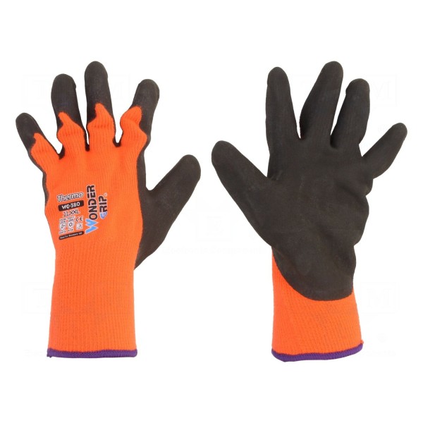 Rękawice ochronne wykonane z połączenia akrylu oraz lateksu charakteryzują się konstrukcją zapewniającą odporność na temperaturę. Produkt w kolorze pomarańczowym dostępny jest w rozmiarze 11 (XXL).