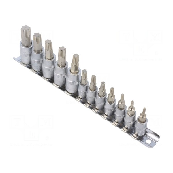 Zestaw kluczy nasadowych typu Torx obejmuje 12 elementów o zróżnicowanych rozmiarach grota: TX08, TX10, TX15, TX20, TX25, TX27, TX30, TX40, TX45, TX47, TX50 oraz TX55. Narzędzia zostały wykonane ze stali chromowo-wanadowej, co wpływa na ich parametry techniczne w trakcie eksploatacji.