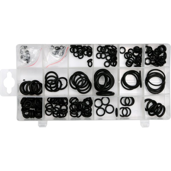 Zestaw zawiera 18 typów o-ringów odpornych na paliwa, oleje oraz chemikalia.