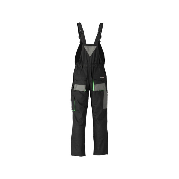Spodnie robocze na szelkach typu ogrodniczki z dziesięcioma kieszeniami, w tym siedem z zapięciem na rzep oraz specjalne kieszenie na nakolanniki.