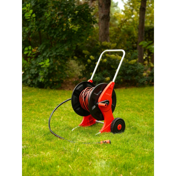 • Stabilna metalowa podpora utrzymuje wózek podczas wyciągania i zwijania węża