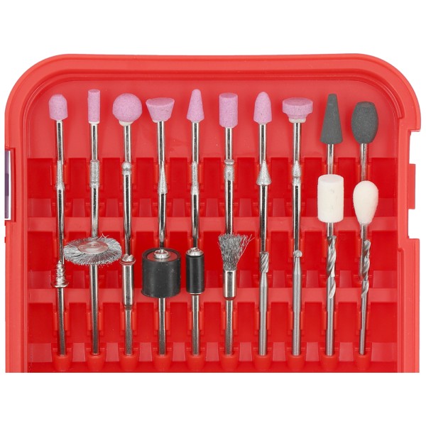 Zestaw zawiera tarcze, wiertła diamentowe, wiertła HSS, frezy, szczotki oraz pastę polerską.