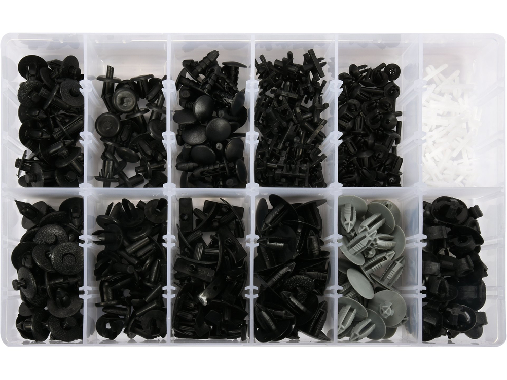Zestaw zawiera 12 rodzajów spinek przeznaczonych do montażu elementów wnętrza i karoserii.