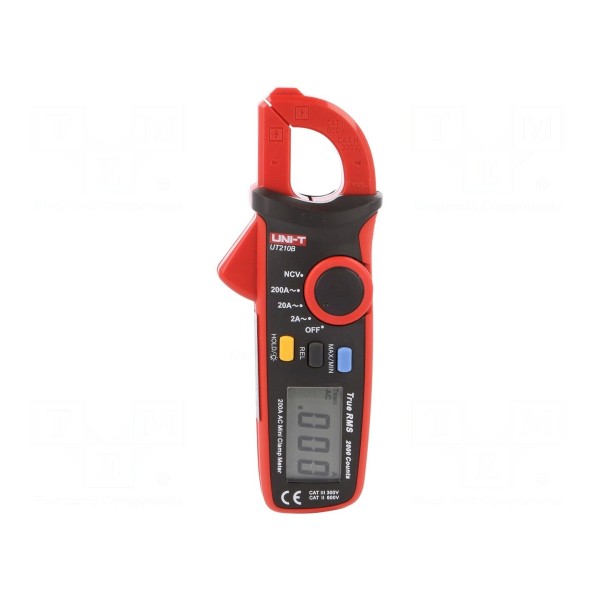 Cyfrowy amperomierz cęgowy UNI-T UT210B przeznaczony jest do pomiaru prądu przemiennego (AC) w zakresie do 200A. Urządzenie obsługuje pomiary rzeczywistej wartości skutecznej True RMS, zapewniając dokładność na poziomie ±(2,5% + 20 digit). Maksymalna średnica mierzonego przewodu wynosi 16 mm.