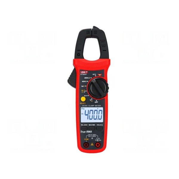 Miernik cęgowy UNI-T UT203+ to cyfrowe urządzenie wielofunkcyjne umożliwiające pomiar prądu AC oraz DC w zakresach 40A i 400A z dokładnością ±(2,5% + 5 digit). Przyrząd wspiera pomiar rzeczywistej wartości skutecznej True RMS oraz oferuje szerokie możliwości diagnostyczne, w tym pomiar napięcia DC do 600V, napięcia AC do 600V, rezystancji do 40MΩ, częstotliwości w zakresie 10Hz–10MHz oraz współczynnika wypełnienia 0,1–99,9%. Maksymalna średnica mierzonego przewodu wynosi 28mm.
