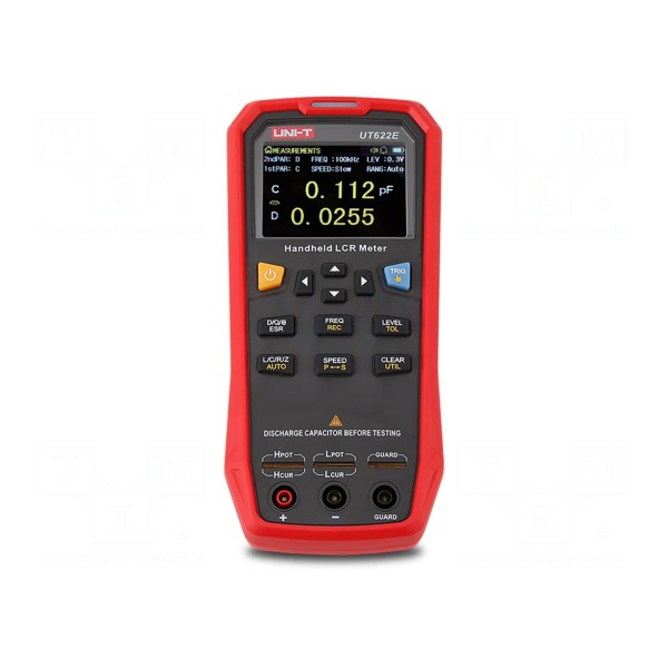 Mostek RLC UNI-T UT622C jest przyrządem przeznaczonym do pomiarów rezystancji w zakresie 0–9,9999MΩ, indukcyjności do 99,999H oraz pojemności do 99,999mF. Urządzenie oferuje wybór częstotliwości pomiarowych: 100Hz, 120Hz, 1kHz, 10kHz oraz 100kHz, przy impedancji wyjściowej wynoszącej 100Ω. Wyniki są prezentowane na wyświetlaczu LCD o przekątnej 2,8 cala, oferującym odczyt 5-cyfrowy.