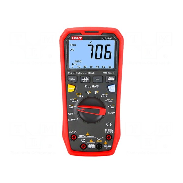Multimetr cyfrowy UNI-T UT161D to urządzenie przeznaczone do pomiaru napięcia AC/DC, prądu AC/DC, rezystancji, pojemności, częstotliwości oraz temperatury w zakresie od -40 do 1000°C. Przyrząd obsługuje pomiar rzeczywistej wartości skutecznej True RMS oraz oferuje pomiar współczynnika wypełnienia w przedziale 0,1–99,9%. Szerokość pasma dla pomiaru napięcia AC wynosi 40–1000Hz, natomiast dla prądu AC 40Hz–1kHz.