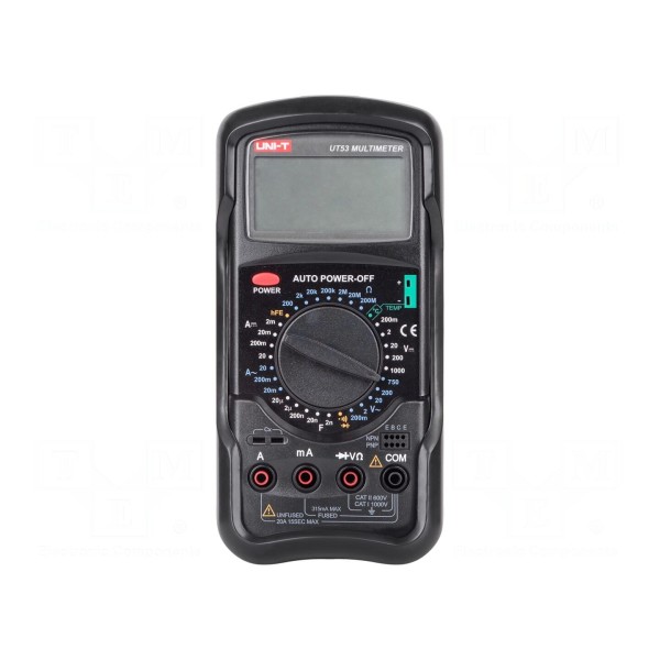 Multimetr cyfrowy UNI-T UT53 to urządzenie umożliwiające pomiar napięcia DC i AC, prądu DC i AC, rezystancji, pojemności oraz temperatury w zakresie od -20 do 1000°C. Przyrząd obsługuje również testowanie ciągłości obwodu z sygnałem akustycznym oraz test diod. Użytkownik może ręcznie zmieniać zakresy pomiarowe, a wyniki odczytywać z wyświetlacza LCD.