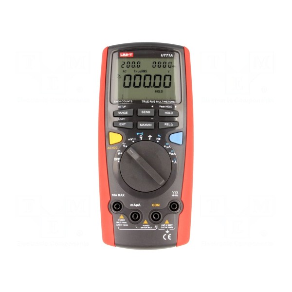 Multimetr cyfrowy UNI-T UT71A to przyrząd pomiarowy wyposażony w wyświetlacz LCD o rozdzielczości 20000 z bargrafem 40-segmentowym odświeżanym z częstotliwością 10x/s. Urządzenie oferuje obsługę funkcji True RMS oraz szeroki zakres pomiarowy dla parametrów takich jak napięcie AC/DC do 1kV, prąd AC/DC do 10A, rezystancja do 20MΩ, pojemność do 20mF oraz częstotliwość do 200MHz. Dodatkowo umożliwia wykonywanie testów diody przy 2,8V oraz ciągłości obwodu z sygnalizacją akustyczną poniżej 40Ω.