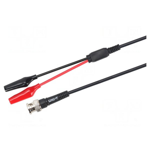 Przewód pomiarowy UT-L02 charakteryzuje się budową opartą na wtyku BNC oraz dwóch zaciskach krokodylkowych. Długość całkowita przewodu wynosi 1 metr, co pozwala na wygodne połączenie urządzeń pomiarowych z elementami badanego układu. Konstrukcja zacisków umożliwia chwytanie przewodów lub komponentów o średnicy do 3 mm.