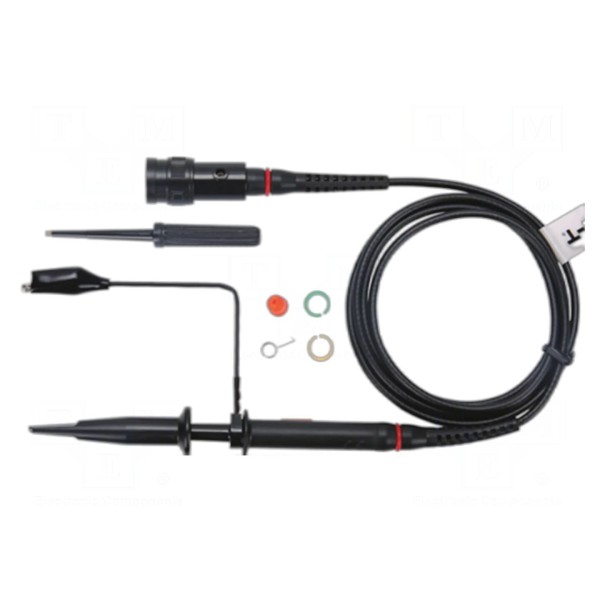 Całkowita długość przewodu sondy wynosi 1,3m. Produkt został zaprojektowany do współpracy z oscyloskopami wyposażonymi w wejścia o odpowiednich parametrach impedancyjnych i złączach BNC.