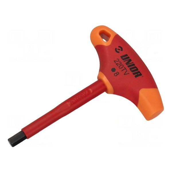 Klucz imbusowy typu T przeznaczony jest do pracy ze śrubami z gniazdem sześciokątnym o rozmiarze 8mm. Konstrukcja narzędzia obejmuje rękojeść w kształcie litery T, która ułatwia przenoszenie momentu obrotowego podczas dokręcania i odkręcania elementów złącznych.