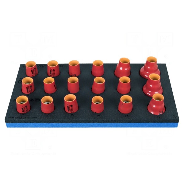Zestaw zawiera 18 izolowanych kluczy nasadowych 6-kątnych z mocowaniem 1/2", przeznaczonych do pracy pod napięciem. W komplecie znajdują się nasadki w rozmiarach: 8, 10, 11, 12, 13, 14, 15, 16, 17, 18, 19, 20, 21, 22, 24, 27, 30 oraz 32 mm.