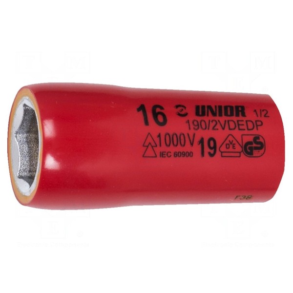 Izolowana nasadka 6-kątna o rozmiarze gniazda 16 mm przeznaczona jest do prac z użyciem kluczy o zabieraku 1/2". Produkt wykonany został ze stali chromowo-wanadowej, co zapewnia parametry wytrzymałościowe narzędzia. Długość całkowita elementu wynosi 54 mm.