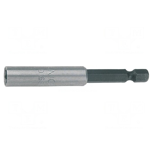 Uchwyt narzędziowy o długości całkowitej 50 mm wyposażony w gniazdo sześciokątne w rozmiarze 1/4". Produkt został zaprojektowany do współpracy z elementami o standardzie mocowania C6,3 mm oraz E6,3 mm.