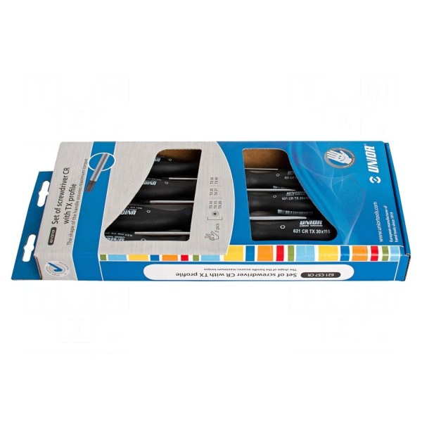 Zestaw zawiera 7 wkrętaków typu Torx o rozmiarach TX10, TX15, TX20, TX25, TX27, TX30 oraz TX40. Narzędzia zostały wykonane ze stali chromowo-wanadowej, co zapewnia odpowiednią trwałość materiału ostrza podczas pracy z elementami złącznymi.
