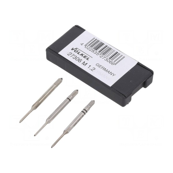 Całkowita długość elementu wynosi 32 mm, a wymiar gniazda uchwytu to 2,1 mm. W zestawie znajdują się 3 sztuki gwintowników.