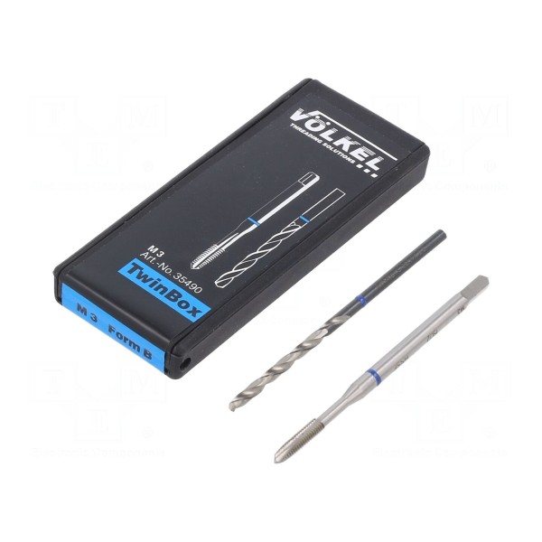 Parametry narzędzia są zgodne z normą DIN 371 oraz tolerancją ISO2/6H. W zestawie znajdują się 2 sztuki akcesoriów. Zawartość zestawu obejmuje gwintownik oraz wiertło.