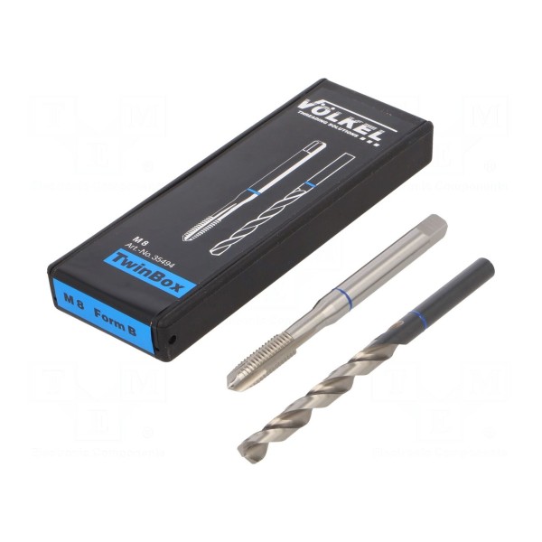 Gwintownik maszynowy VÖLKEL M8 wykonany jest ze stali szybkotnącej kobaltowej HSS-E, co zapewnia odpowiednią wytrzymałość podczas obróbki. Narzędzie zostało zaprojektowane zgodnie z normą DIN 371 i pracuje w tolerancji ISO2/6H przy skoku gwintu wynoszącym 1,25.
