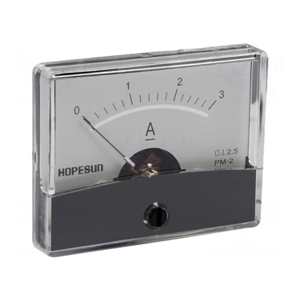 Amperomierz analogowy przeznaczony do montażu na panelu urządzenia. Urządzenie służy do bieżącego monitorowania natężenia prądu stałego w zakresie od 0 do 3A.