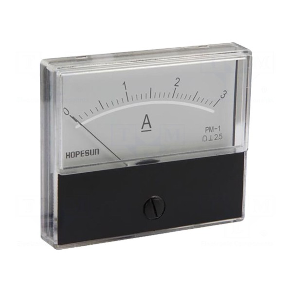 Amperomierz analogowy przeznaczony do montażu panelowego umożliwia pomiar prądu stałego (DC) w zakresie od 0 do 3 A. Urządzenie charakteryzuje się klasą dokładności 2,5, co pozwala na bieżące monitorowanie wartości prądu w układach elektrycznych.
