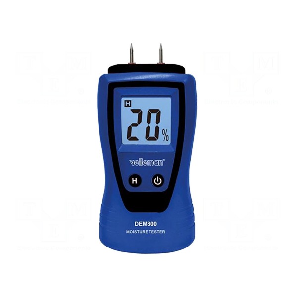 Higrometr VELLEMAN DEM800 przeznaczony jest do pomiaru wilgotności materiałów budowlanych, drewna oraz papieru. Urządzenie charakteryzuje się zakresem pomiarowym od 5% do 90% RH oraz dokładnością wynoszącą 2%. Wyniki pomiarów prezentowane są na wbudowanym wyświetlaczu LCD.