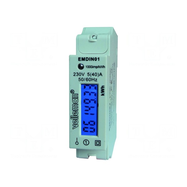 Licznik energii elektrycznej VELLEMAN EMDIN01 to cyfrowe urządzenie montażowe przeznaczone do pomiaru energii w sieciach 1-fazowych. Urządzenie charakteryzuje się bezpośrednią metodą pomiaru oraz napięciem znamionowym 0,23kV. Praca licznika odbywa się w zakresie częstotliwości od 50 do 60Hz, przy prądzie maksymalnym wynoszącym 40A.