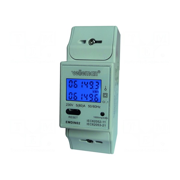 Licznik energii elektrycznej VELLEMAN EMDIN02 to cyfrowe urządzenie montażowe przeznaczone do pracy w sieciach jednofazowych. Urządzenie realizuje bezpośredni pomiar zużycia energii w instalacjach o napięciu znamionowym 0,23kV oraz częstotliwości pracy w zakresie od 50 do 60Hz. Maksymalny obsługiwany prąd wynosi 80A, przy czym licznik charakteryzuje się klasą dokładności 1.