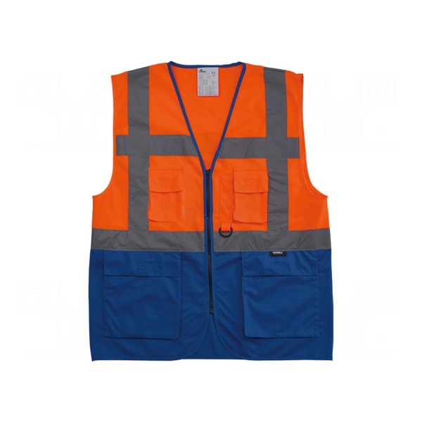 Kamizelka odblaskowa w wersji ostrzegawczej przeznaczona jest do poprawy widoczności użytkownika w warunkach ograniczonego oświetlenia. Produkt wykonany jest w kolorystyce pomarańczowo-niebieskiej.