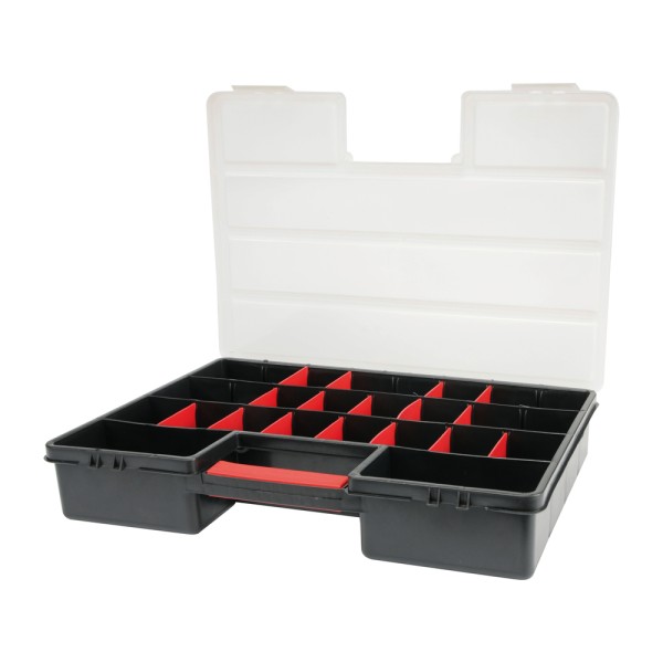 Służy do przechowywania drobnych elementów złącznych, części zamiennych oraz małych narzędzi. Wygodny uchwyt umożliwia przenoszenie.